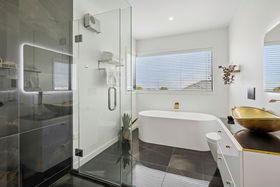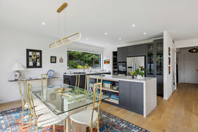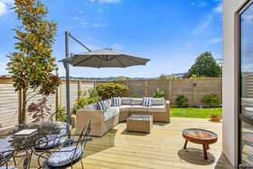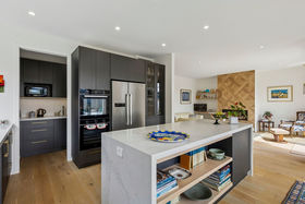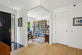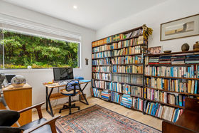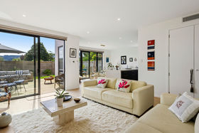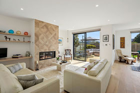 The entry level is dedicated to beautifully executed open-plan living, where oak flooring underfoot and a feature tiled gas fireplace anchor the space with warmth and texture. Large sliding doors connect seamlessly to an alfresco setting " a sunny, fenced courtyard framed by easy-care landscaping, designed for relaxed entertaining rather than weekend upkeep. The kitchen is both functional and visually impressive, appointed with stone benchtops, double ovens, gas cooking, brushed brass accents and a well-configured butler's pantry. A versatile room on this level, opening via cavity sliders, offers the option of a fourth bedroom or home office.